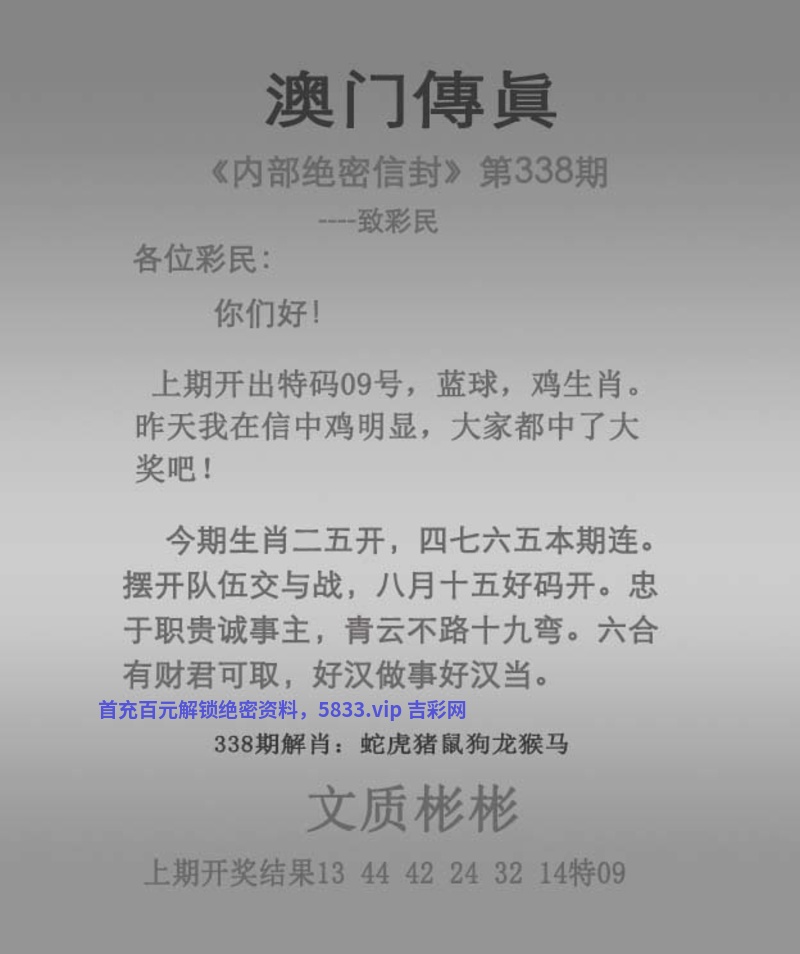 | 337期:★吉凶中特★【吉美】开:鸡09中 |